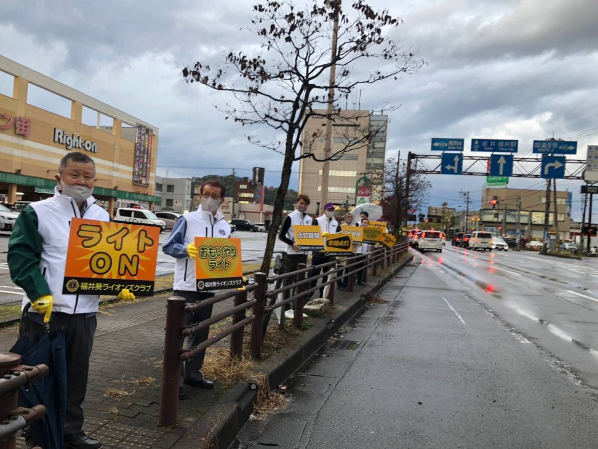 2021年度福井葵ライオンズクラブは11月10日(水)おもいやりライト運動「いい点灯の日」の早期ヘッドライト点灯呼びかけ事業を行いました。おもいやりライト運動とは、交通事故が一番多いと言われる夕方16時~18時の薄暗くなる時間帯に早めのヘッドライト点灯を促し、ドライバー・歩行者双方にとって相手が見えにくいことをなくします。交通事故削減のための運動です。